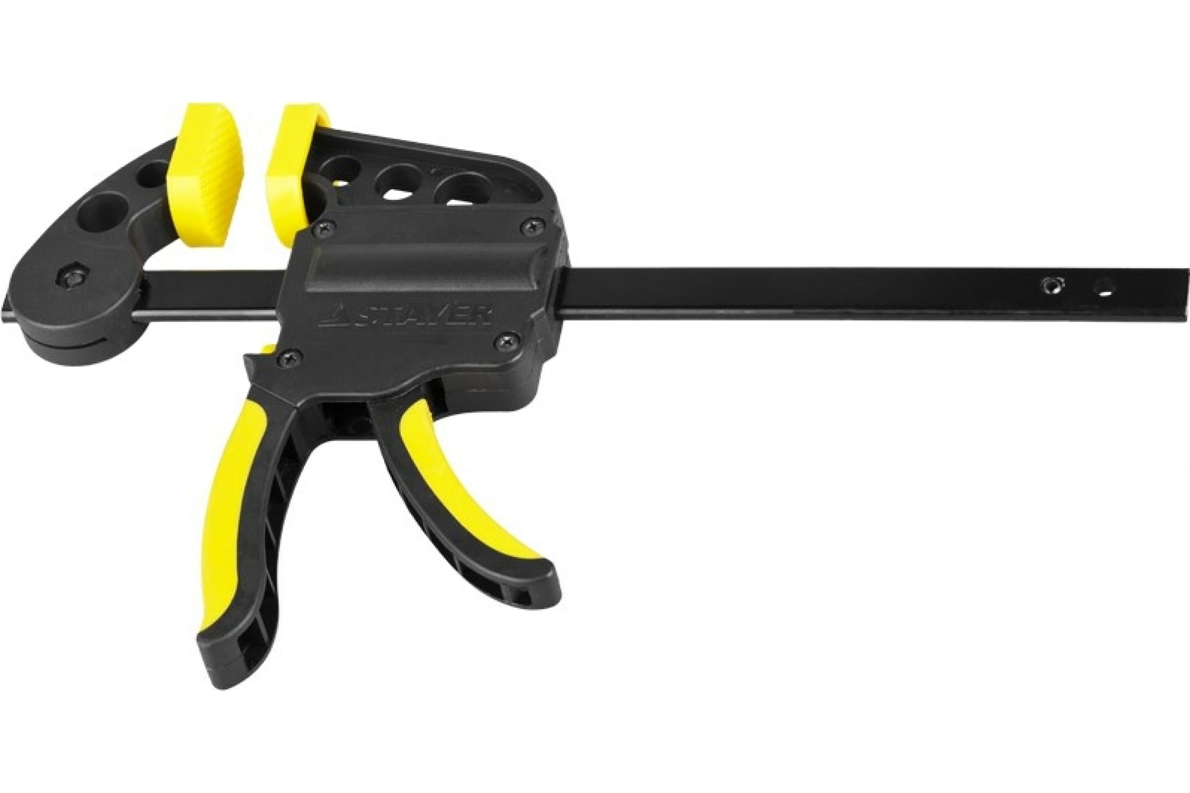 - Переставная конструкция ручной пистолетной струбцины STAYER PROFI 150 мм 32242-15 для сжатия и распора;