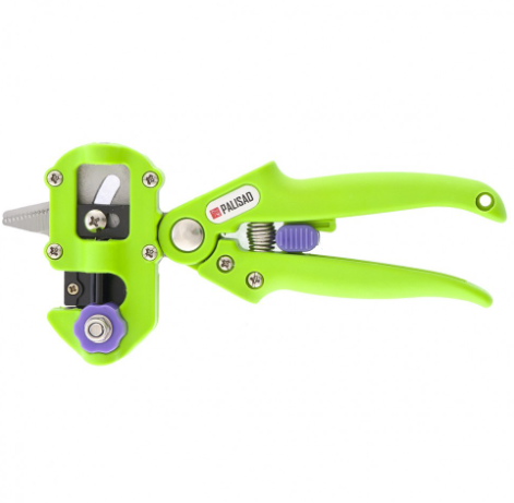 Прививочный секатор Palisad 60502 длиной 215 мм, со сменными ножами, используется для прививки плодовых растений черенком. Фигурные ножи секатора изготовлены из рессорно-пружинной стали, поэтому обладают высоким ресурсом (рассчитаны на 5000 срезов без дополнительной заточки). В комплекте U-образный, V-бразный и ?-образный ножи, что позволяет работать с черенками различной толщины и плотности. Вырезы, сделанные на подвое и привое, идеально совместимы друг с другом, дополнительная подгонка им не требуется.